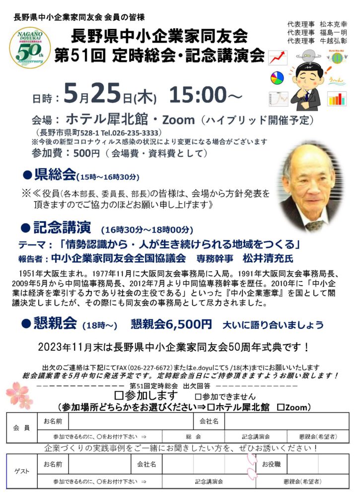 2023年5/25[木]15:00 ~ 21:00長野同友会 第51回定時総会・記念講演会 2023年4月25日 各地同友会の行事 【県総会】15:00~ ハイブリッド開催 【記念講演会】16:30~ ハイブリッド開催 テーマ:「情勢認識から・人が生き続けられる地域をつくる」 報告者:松井 清充氏(中小企業家同友会全国協議会 専務幹事) 【懇親会】18:00~(希望者) 主催:長野県中小企業家同友会 お問合せ先:026-268-0678 会場:ホテル犀北館・Zoom(ハイブリット開催を予定)