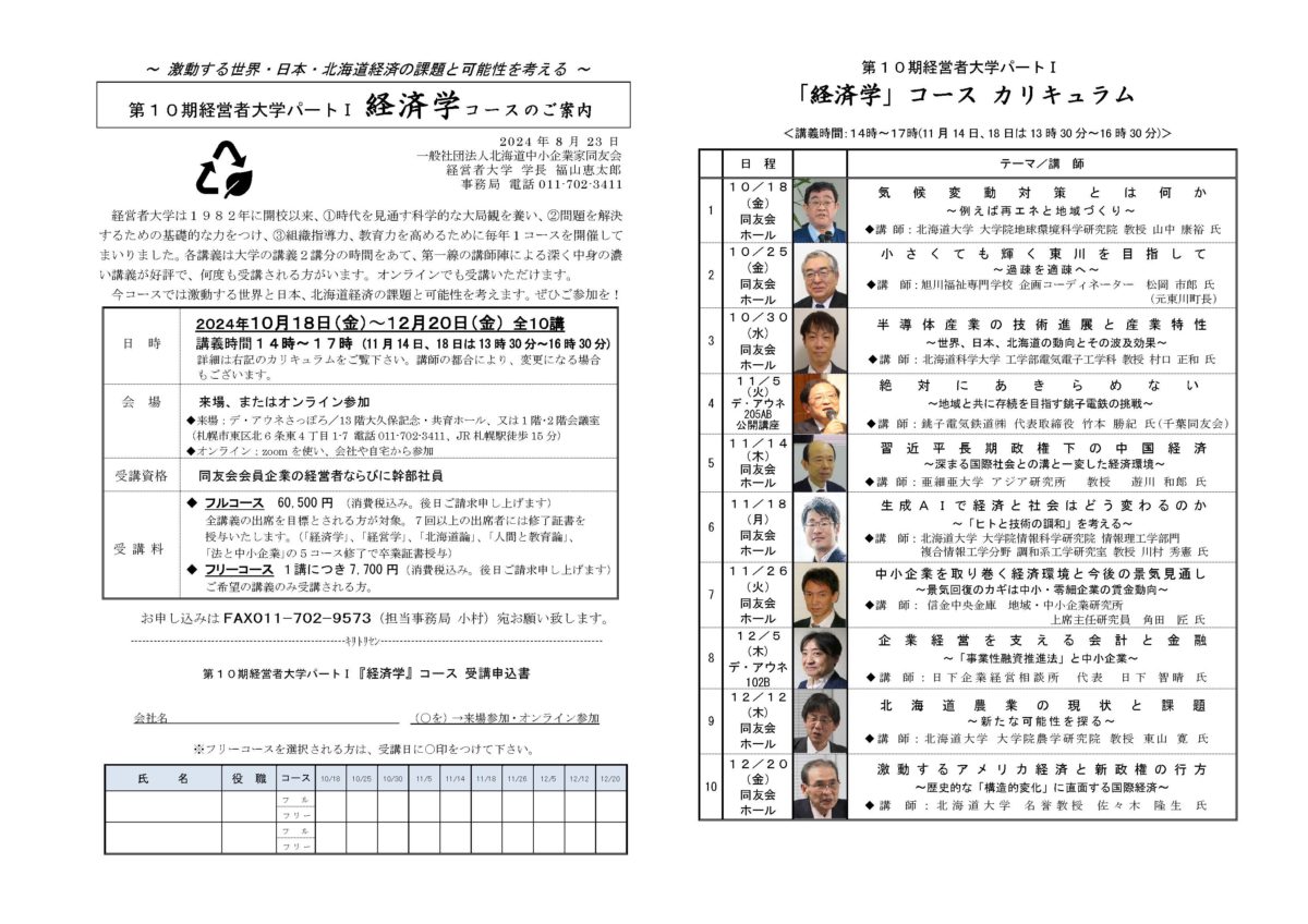 今コースでは、「激動する世界・日本・北海道経済の課題と可能性を考える」ことを目指して8名の新講師を迎え、最新の経済情勢とこれからの企業づくり、地域づくりを学びます。ぜひご参加下さい!