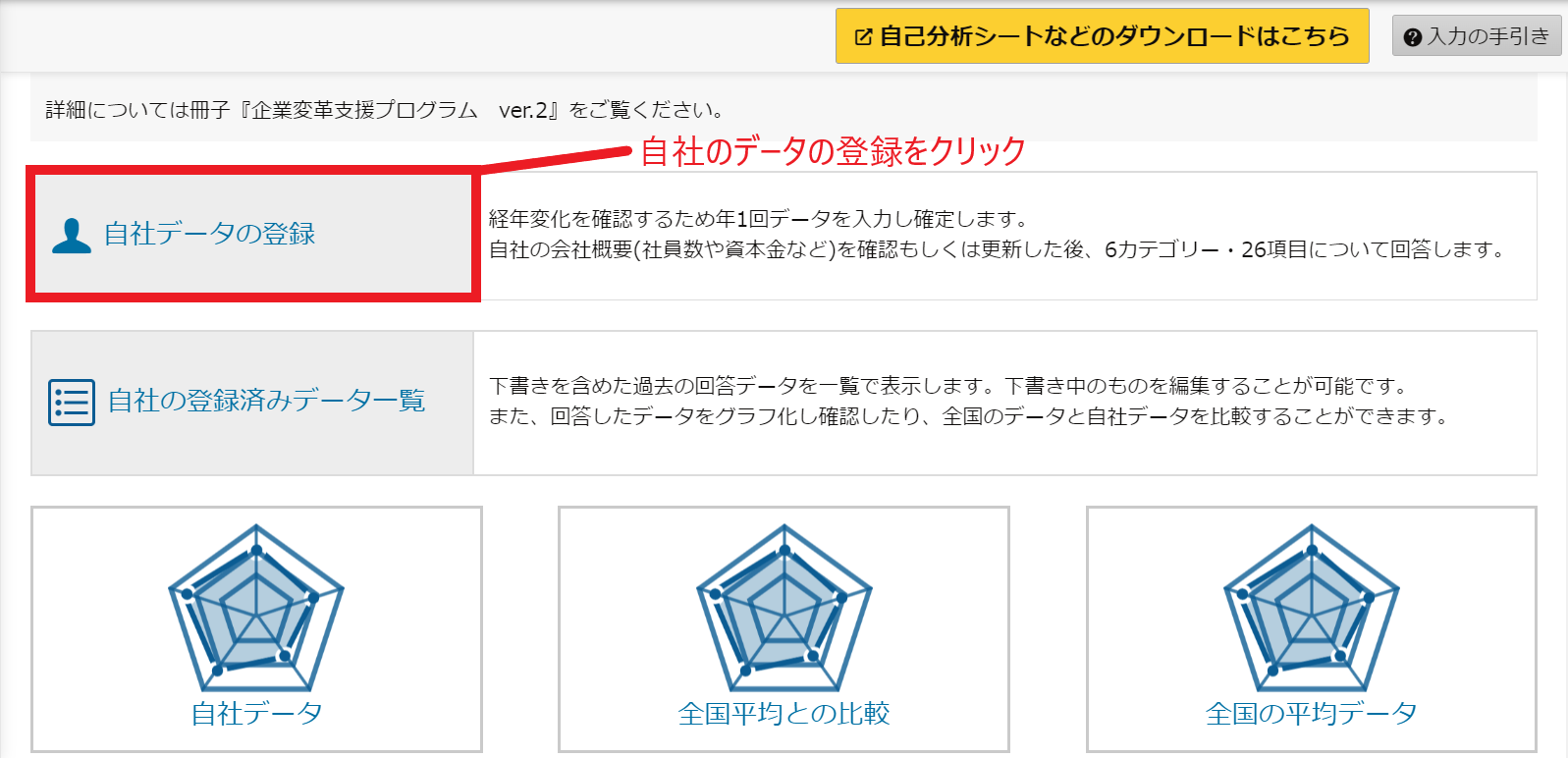 (1)「企業変革支援PG」のメニューを選択すると、左図のような画面になりますので、「自社データの登録」をクリックします。 |