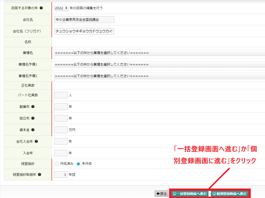 (2)新しく回答データをつくる際には、毎回その時の会社の情報を確認し、登録します。表示しているデータは、同友会のデータベースに登録されている内容ですので、修正はこの画面で行ってください。修正したら、「一括登録画面に進む」か「個別登録画面に進む」を選択します。 |