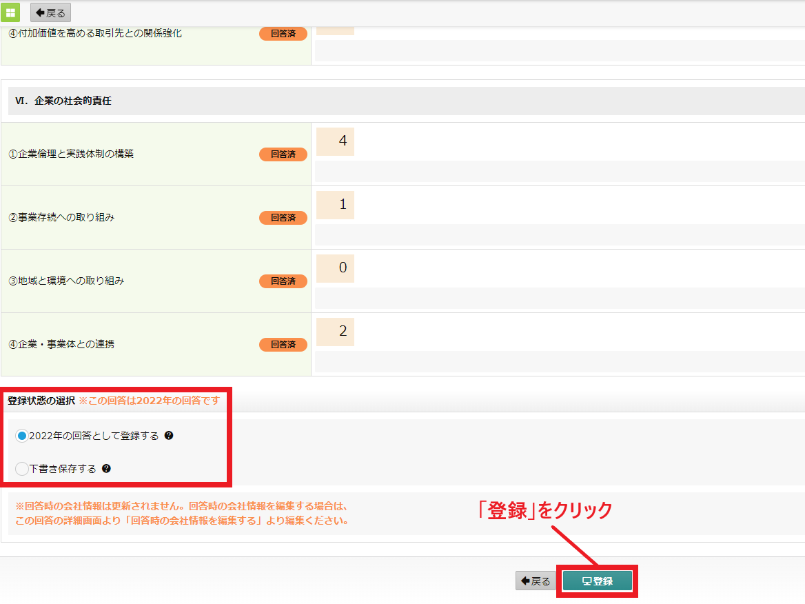 (6)確認画面が表示されます。下方向へスクロールし、登録状態の選択のところで、「○○年の回答として登録する」を選択し「登録」をクリックします。