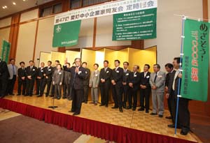 懇親会では、鋤柄修中同協会長から、「経営者が1度掲げた目標を下ろすわけにはいかない。中同協は5万名を目標にしているが、愛知の5000名とどちらが早く達成できるか競争しましょう」と、お祝いと激励の言葉がありました。