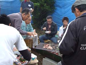 「見」た後は「食べる」。生産者の会員が持ち寄った食材でバーベキュー。(株)牛勝の牛肉、ありた(株)の鶏肉、フェルマ木須の米で作ったおにぎりと玉ねぎ、(有)伊万里グリーンファームの小ねぎ、(有)アリウラの特製のたれ、(有)みのり農場のロールケーキとプリンと盛りだくさん。
