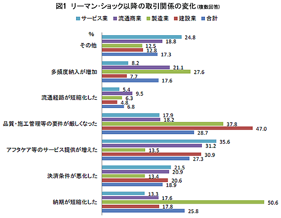 全業種では「品質・施工管理等の要件が厳しくなった」(28・7%)、「アフタケア等のサービス提供が増えた」(27・3%)、「納期が短縮化した」(25・8%)が3大変化項目となっています(図1)。しかし業種ごとにみると、その内容はだいぶ異なっています。