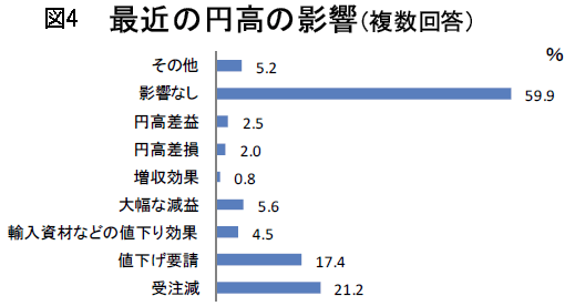 さらに最近の円高の影響について聞いています(図4)。大半は影響なしとしていますが、「受注減」(21・2%)、「値下げ要請」(17・4%)などでの影響が出ています。とくに製造業では「受注減」(34・9%)、「値下げ要請」(27・1%)で強くその影響が現れています。