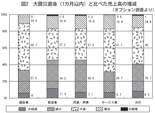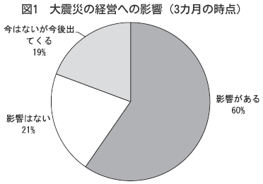 今回のDOR調査で実施した震災発生から3カ月後の影響についてたずねたオプション項目では、「影響がある」が60%、「今後影響が出る」と答えた企業が19%を加えると約8割の中小企業で震災による経営環境の悪化が顕在化しつつあります(図1・2)。業種別では大震災や原発事故による素材・部品調達の断絶や分工場・協力企業の被災、燃料不足と交通網の分断などの影響を受けた製造業と消費自粛・品不足による商業で悪影響が大きく現れています。