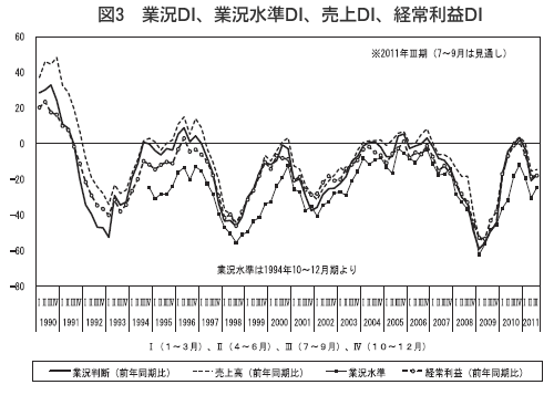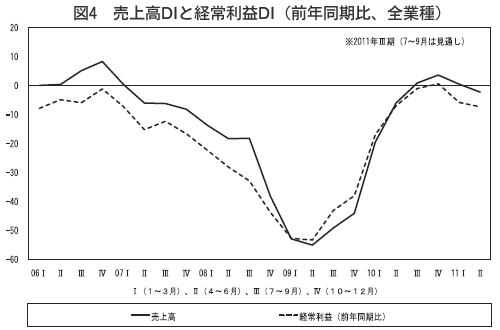 売上高DI(「増加」-「減少」割合)も2011年4~6月期は1→△15と悪化しました。製造業が5→△20で25ポイント、建設業が△10→△14で4ポイント、流通・商業も2→△8で10ポイント、サービス業も△2→△21で19ポイントの低下と4業種すべてで悪化しました。