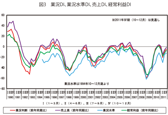 東日本大震災で破断されたサプライチェーンが急速に回復してきたことを受けて、景況は予想を上回る回復を見せました。7~9月期の業況判断DI(「好転」-「悪化」割合)は2011年4~6月期に比べ12ポイント改善して△9と反転しました(図3)。業況水準DI(「良い」-「悪い」割合)も△30→△15と15ポイント改善しました。景況は震災前水準に到達しています。