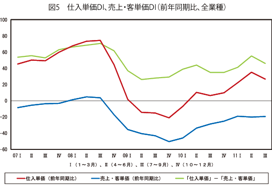 一方、仕入単価DI(「上昇」-「下降」割合)は原油先物価格、銅価格等の国際価格の低落を背景にして35→27と8ポイント超過幅が縮小しました。しかし依然として高止まりを続けている状況です。売上・客単価DI(△19)との差が46ポイントと前回より9ポイント縮小しましたが、まだ看過できない大きさが続いています(図5)。次期の仕入単価DIは今回同様の水準が続くとの見方が強く、高止まりが続くことが予想されます。