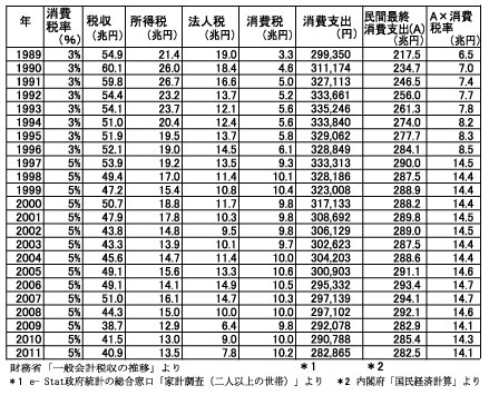 参考に民間最終消費支出にだけ消費税率をかけたらどのような税額になるのかを載せていますが、そうすると2011年の場合、7%強の税率で約20兆円に達します。消費税による税収増加と同時に、10%という税率の根拠も不明確と言えます。