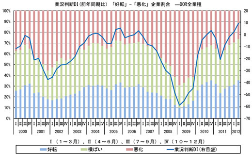 4~6月期調査では、前年同期比の業況判断DI(「好転」―「悪化」企業割合)は2→9と7ポイント改善しました(表)。前年の4~6月期が東日本大震災のボトムであったことから、“谷深ければ山高し”で改善感が顕著に現れています。