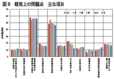経営上の問題点では「同業者相互の価格競争の激化」(56.3%)がトップ、「民間需要の停滞」(46%)が続いています(図8)。一方で「従業員の不足」、「熟練技術者の確保難」など人材確保に関わる指摘も少しずつ増えてきています。