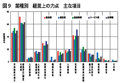 経営上の力点では「新規受注の確保」(63%)、「付加価値の増大」(49%)が多く、これに対応する体制づくりのための「社員教育」(41%)、キャッシュフロー管理と損益分岐点引き下げのための「財務体質の強化」(28%)が引き続き重要な課題となっています(図9)。