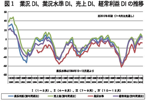 2012年4~6月期の業況判断DI(「好転」-「悪化」割合)は2→9と7ポイント改善しました。同じく売上高DI(「増加」-「減少」割合)は5→11と6ポイント、経常利益DI(「増加」-「減少」割合)は△2→5と7ポイント改善し、そろって水面に浮上しました(図1)。しかし東日本大震災直後の2011年4~6月期との比較なので、改善感が大きくなっていることに注意が必要です。現に前期比の業況水準DI(「良い」-「悪い」割合)は△8となお水面下にあり、回復は遅れています。また、次期については業況判断DI(9→4)、売上高DI(11→6)、経常利益DI(5→3)と、それぞれで悪化を見込んでおり、中小企業景気の回復は息切れすると予想されています。
