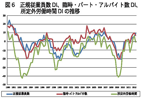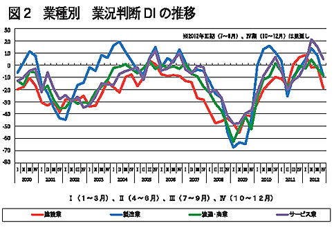 この上昇は次期以降には引き継がれず、7~9月期は9→4と5ポイント下降、10~12月期も下降が続く見込みです。欧州債務危機の延長、円高による収益悪化、中国経済減速、国内政局不安定による日本経済への影響が懸念されており、中小企業景気の回復は息切れの兆しが現れています。(8面で詳報)