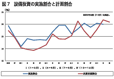 設備の過不足感DI(「過剰」―「不足」割合)は△10→△11と不足感が続いているものの、投資実施割合は前期とほぼ同水準(30%)にとどまりました(図7)。設備投資の実施目的は、「能力増強」が比率を下げた(41%→38%)一方、「維持補修」が比率を上げ(29%→38%)ました。力強く設備投資の実施に向かっていけないもどかしさがうかがえます。