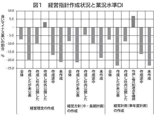 そして、すべてを作成している場合とそうでない場合に分けて業況水準DI、業況判断DI 、売上高DI、採算DIを比べたところ、いずれの指標においても、すべてを作成している企業層が10から15ポイントほど高く、経営指針作成の重要性が改めて示されるところとなりました。