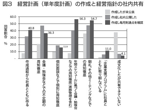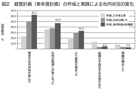 そうすることにより社内状況にも変化が見られてくることがわかります。図2は、この点を捉えたものです。計画の到達点を毎月確認するようになると、理念の社内共有が一層進みますし、社内の風通しも良くなってきます。そして、結束が強まったことを実感する割合も高くなってきます。