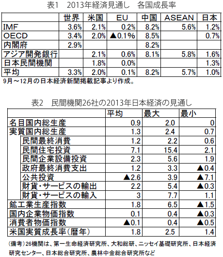 日本の民間機関26社の予想の平均では、2013年の成長率は実質1.3%、名目0.9%と見込まれています(表2)。1.6から0.7という世界の各機関の予想からもほぼこの見込みが妥当であると思われます。しかし、消費税増税前の住宅駆け込みが5.2%増92万戸と予想され、震災復興需要も見込まれる建設業の一部を除けば、「マイナスにはならないがほぼゼロ成長」が今年も一番素直な見方と言えるのではないでしょうか。