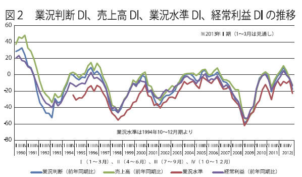 DORの2012年10~12月期の業況判断DI(「好転」-「悪化」割合、前年同期比)は2→△5と7ポイント悪化しました。前期比の業況水準DI(「良い」-「悪い」割合)は△10→△7とわずかに改善しましたが、なお水面下深くに低迷しています。さらに先行きをみると業況判断DIは△5→△18、業況水準DIは△7→△23とそれぞれ大きな悪化見込みで、ミニ・リセッション(景気後退)の可能性があります。中小企業景気は年初に一層の冷え込みの様相です。(図2)