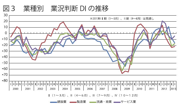 業況判断DIを業種別に見ると、製造業が△6→△16で10ポイント悪化、その一方で建設業は2→11と9ポイント好転しました。製造業は特に機械金属系業種の落ち込みが激しく、日中関係問題による対中輸出の減少の影響がうかがえます。建設業は震災復興需要の余波を受けて4業種の中で唯一プラス値を伸ばしています。(図3)