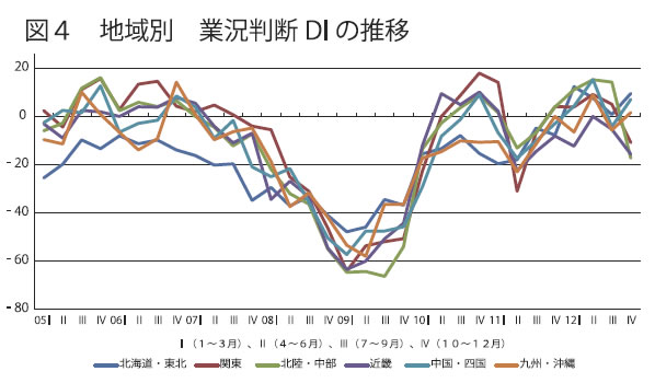 地域経済圏別では、大都市圏の関東が5→△11で16ポイント悪化、北陸・中部が14→△17で31ポイント悪化、近畿が△5→△16で11ポイント悪化でした。地方圏では北海道・東北が1→9で8ポイント改善、中国・四国が△4→7で11ポイント改善、九州・沖縄が△6→2で8ポイント改善です。大都市圏と地方圏で明暗が分かれています。(図4)