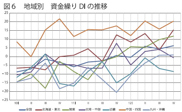金融面では、資金繰りDI(「余裕」または「やや余裕」-「窮屈」または「やや窮屈」割合)は4→6となりわずかに余裕感が拡大しました。しかし資金繰りDIの地域間格差が拡大しており、もっとも余裕感のある中国・四国ともっとも窮屈感が強い近畿の格差は29となりました(図6)。今後の動向に注意が必要です。また3月末の中小企業金融円滑化法の終了にあたり、取引先・顧客・外注先からの間接的影響があり得ることにも十分に注意する必要があります。