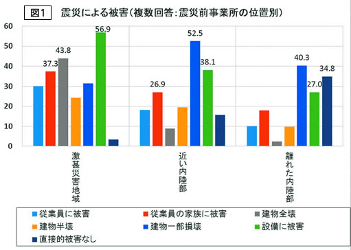 図1は震災による被害状況を示したものである。激甚災害地域では半数以上が設備に被害を受けており、建物全壊(43.8%)も極めて高い。従業員とその家族の被害も他地域に比べて圧倒的に高い比率である。しかし内陸部でも建物一部損壊や設備への被害がかなりの割合で存在しており、事業継続が困難になる状況が広い範囲に及んでいた。