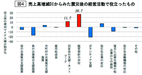 今回の調査では、同友会会員企業の健闘の背景にあったものも浮き彫りになっている。「震災後の経営活動で役立ったもの」について、震災前と比べた売上高増減の視点から見ると、トップにくるのが「経営指針の存在」(26.7%)である。次いで、「同友会の支援・ネットワーク」(11.7%)である(図4)。つまり、震災後の売上が回復した企業ほど経営指針の存在と同友会の支援・ネットワークの重要性を認識していた傾向がある。