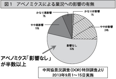 中同協7~9月期景況調査(DOR)で「アベノミクス」が自社の業績にどのような影響を与えたか尋ねた項目では「好影響があった」のは25%にとどまる一方、「影響なし」が53%と過半数にのぼり「悪影響」は22%でした(図1)。「アベノミクス」の効果を実感している中小企業は一部にとどまり、多くの企業には効果が及んでいないことが浮き彫りになりました。
