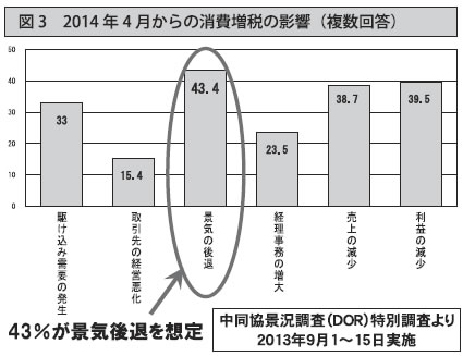 こうした中、決定された消費増税の影響については「景気の後退」を想定する企業が43%、さらに「利益の減少(39・5%)」、「売上高の減少(38・7%)」が続き、約4割は景気後退と同時に自社の売上・利益が減少する悪影響を予想しています(図3)。
