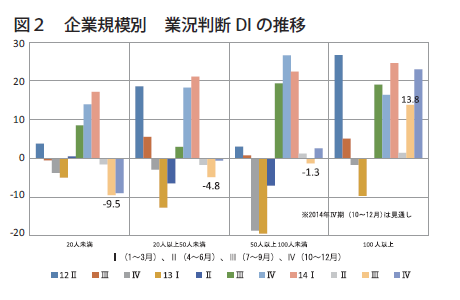 企業規模別では100人以上が1→14で13ポイント好転しました。しかし、それ以外は50人以上100人未満は1→△1で2ポイント、20人以上50人未満が△2→△5で3ポイント、20人未満は△2→△9で7ポイント、と軒並み悪化しました。規模が小さくなるほど苦境の重圧が大きくなっている構図が見えてきます(図2)。
