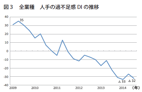 消費増税直前の2014年1~3月期以降の推移を見てみると、1人当たり売上高DI(「増加」-「減少」割合)は(17→△4→△4)、1人当たり付加価値DI(「増加」-「減少」割合)は(8→△8→△9)と、急落したまま引き続き水面下を推移しています。人手の過不足感DI(「過剰」-「不足」割合)は△27→△32と、前期よりも不足感が強まりました(図3)。なかでも、建設業(△42→△49)の人手不足感は深刻です。