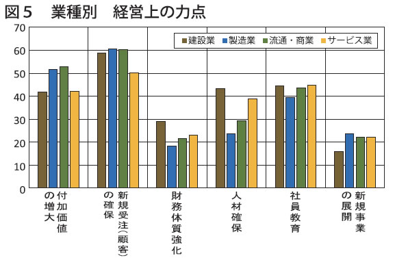 消費マインドが低下し売上悪化傾向が続くなか、地域やユーザー特性に見合った市場の差別化を図っていくことが当面の努力目標といえます。今期の経営上の力点でも「新規受注(顧客)の確保」、「付加価値の増大」を指摘する割合が高くなっています。また、人手不足への危機感の高まりから「社員教育」「人材確保」も増加が続いています。選ばれる会社づくりの根幹は人材育成にあるということが意識されるようになってきました。今こそ経営指針に基づいた全社員の創造型の会社づくりが求められています(図5)。