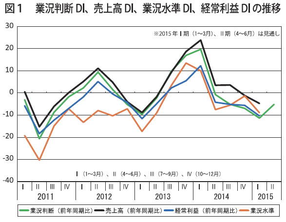 2014年10~12月期におけるDORの業況判断DI(「好転」-「悪化」割合)は消費増税直後の2014年4~6月期から△1→△5→△7と3期連続で悪化、2015年1~3月期の見込みは△7→△11とさらなる悪化を見込んでいます (図1)。