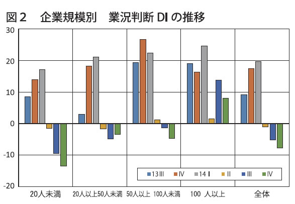 企業規模別では20人以上50人未満だけが△5→△3で2ポイント好転しましたが、100人以上が14→8、50人以上100人未満は△1→△5、20人未満は△9→△13と悪化しました。落ち込み幅としては100人以上が大きいですが、他の企業規模も水面下にあり、依然厳しい状況が続いています(図2)。