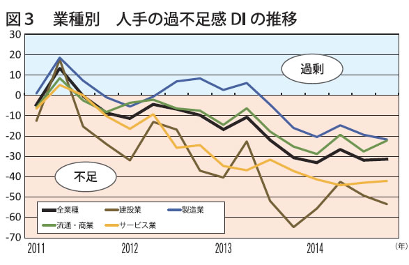 雇用面では人材不足が深刻です。人手の過不足感DI(「過剰」-「不足」割合)は2011年7~9月期から人手が「不足」側に転じて以来、徐々に不足感が強まり、2013年10~12月期から△31→△33→△27→△32→△32と高止まりしています(図3)。経営上の問題点、力点に関する項目の採用に関する指摘割合も上昇を続けており、人手不足に対する危機感の高まりを示すものとなっています。なかでも建設業(△49→△53)は他の3業種より10ポイント以上も不足感が強く、いっそう深刻な状況です。