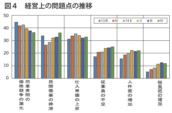 2014年4月に実施された消費増税後の景況悪化は各指標にもはっきり示されていますが、経営上の問題点として指摘された「民間需要の停滞」の割合も上昇し続けています。「仕入単価の上昇」も依然高い水準で推移しています。また、「従業員の不足」「人件費の増加」といった「人」に関わる問題意識も高まってきています(図4)。