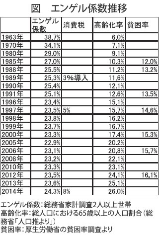 2014年のエンゲル係数について「24.3%と21年ぶりの高水準、家計のゆとり低下、消費増税による支出抑制で、生活水準低くなる。14年度月平均消費支出28.8万円と 2%減に対し食料品支出は1%増の7万円」と報道されました。1995年から23%台が続いてきたものが93年と同じ24.3%に逆戻りしました(図)。消費増税と物価上昇の影響が大きかったことがわかります。エンゲル係数は「消費支出」に占める「食料品」の割合を表します。生活が苦しくなるほど上昇する傾向を見せますが、2005年を底値に少しずつ値を積み増しています。 今回の上昇と過去の消費税との関係で見ると、1989年の消費税3%導入のときは翌年のみ上昇、1997年の5%引き上げの時も翌年のみ上昇でした。円安による輸入物価上昇が食料品価格を押し上げていることも原因ですが、今回の上昇の影響は別に考える必要があります。1つは高齢化率がずっと右肩上がりに上昇しており、エンゲル係数が元々高くならざるを得ない高齢層(65歳以上人口割合)の比率が増加しているのが大きな要因です。もう1つは所得格差が拡大し貧困化が進んでいる影響です。2012年の日本の相対的貧困率が16.1%で、こどもの貧困率が過去最悪の16.3%になったのを受けて、政府は2014年8月、「子どもの貧困対策大綱」を初めて策定しました。