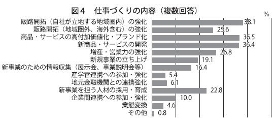 次に、仕事づくりに「取り組んでいる」、「検討している」企業の仕事づくりの内容について(複数選択)は、「販路開拓(自社が立地する地域圏内)の強化」が最も多く、「販路開拓(地域圏外、海外含む)の強化」とは10ポイント以上の差があります(図4)。「新事業を担う人材の採用・育成」は22・8%と存在感を示し、「新規事業の立ち上げ」の19・1%を上回りました。販路開拓や営業力強化、新商品・新サービス開発のうえで、それを担う社員教育の課題の重要性が意識されています。実際に「新年度の経営指針(中期計画共)の発表と、個人テーマ・数値目標を全社員が発表し、新しく取組んでいます。特に新規事業に2部門が加わり、体制を組み替えて、実践を開始しています(岡山、管工事業)」という企業もあるように、新しい仕事づくりに向けて経営指針を軸にして体制を構築し、社員と共に実践することが重要です。