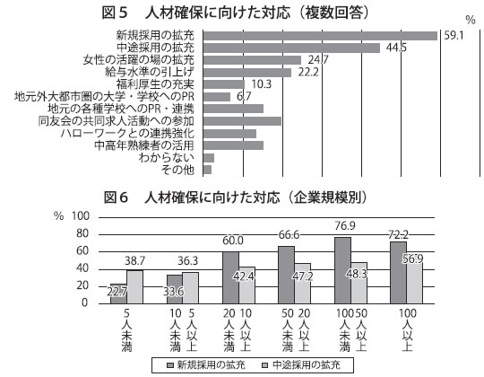 体制を構築するうえで計画的な人材確保が欠かせません。今回の調査で「人材確保に向けた対応」を聞いたところ(複数回答)、「新規採用の拡充」が59・1%でダントツ、継いで「中途採用の拡充」が44・5%であり、両者は15ポイント近い差が開きました(図5)。対象企業では計画的な新規採用が重視されていることがうかがえます。これを企業規模別に見ると、5人未満と5人以上10人未満では「中途採用の拡充」が「新規採用の拡充」を上回ったものの、10人以上の全ての規模では「新規採用の拡充」が上回っています(図6)。同友会らしく企業規模は小さくても計画的な新卒採用と、社員教育が重視されています。地域での人材定着・育成につながる貴重な貢献といえます。