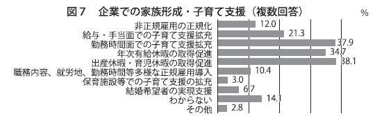 企業での家族形成・子育て支援(複数回答)については「出産休暇・育児休暇の取得促進」が38・1%、「勤務時間面での子育て支援拡充」が37・9%とほぼ同水準で並びました(図7)。産休・育休の取得促進、時短勤務の拡充に柔軟な姿勢が多く、仕事と子育てを両立できる企業づくりが進んでいます。こうした両立支援はその地域社会への貢献のみならず、企業にとっても優秀な社員が定着する、社員の就労意欲が上がる、業務体制を見直すきっかけになるなどの効果があると言われ、多くの企業に広がることが期待されます。