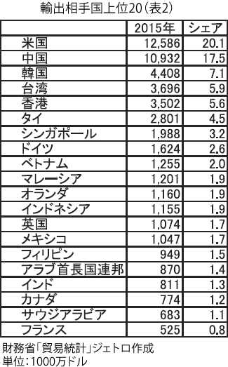 2015年日本の輸出相手国上位20カ国(表2)で見ると、1位の米国は別にしても上位6カ国までは訪日外国人客数の順位と同じ国であり、輸出上位で観光客が少ないのはオランダ、メキシコ、UAE、サウジアラビアの資源国。観光客が多いのに輸出が少ないのは豪州とイタリアとなっています。つまり輸出上位国からの観光客が増えているということは、メイドインジャパンの良さがあるということの相関関係が示されているデータと言えます。本当の日本の良さを出していかないと観光客も来なくなるという意味にも取れる関係でした。