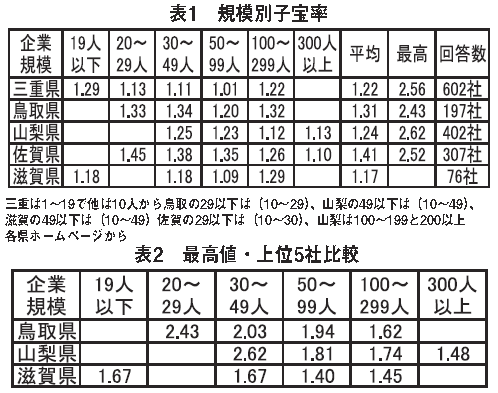 2011年から全国に先駆けて福井県が企業の合計特殊子宝率(愛称:企業子宝率)の調査を行い、2014年鳥取県、山梨県、滋賀県、2015年から佐賀県と三重県が実施しました(2015年静岡県は表彰)。企業規模別に発表している4県を見ると、企業規模が小さいほど子どもが多い結果です(表1)。しかも最高値比較や上位5社比較ではさらに明白です(表2)。規模別子宝率では、滋賀県だけ例外ですが、回答76社で100人以上が7社だけですので上位5社分のみで見たほうが正確と思われます。地域の危機である少子化を防ぐ企業の貢献として、労働環境を良くして社員の子どもの数が全て2.1人以上になるようであれば良い企業指標になると思いますがいかがでしょうか。