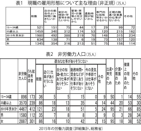 非正規についた主な理由別をみると、「正規の職員・従業員の仕事がない」が男性は157万人(26.9%)と最も多く、女性は158万人と「不本意非正規」といわれる人が合計315万人になります(表1)。さらに非労働力人口のうち、就業希望者は412万人でそのうち「適当な仕事がありそうにない」は121万人でした(表2)。完全失業222万人+不本位315万人+仕事無121万人を合計すれば658万人もの人が希望する仕事があれば働きたいとしています。