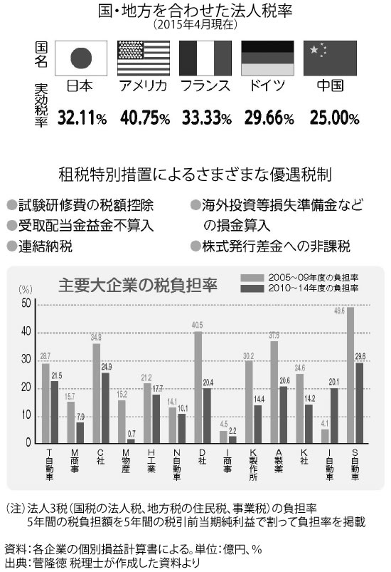 主要大企業の実際の税率は、さまざまな優遇税制により低くなっています。さらに法人税率を引き下げても設備投資や賃金に回らないのが現実です。また、法人税率を引き下げれば海外の企業が日本に進出すると思いますか?