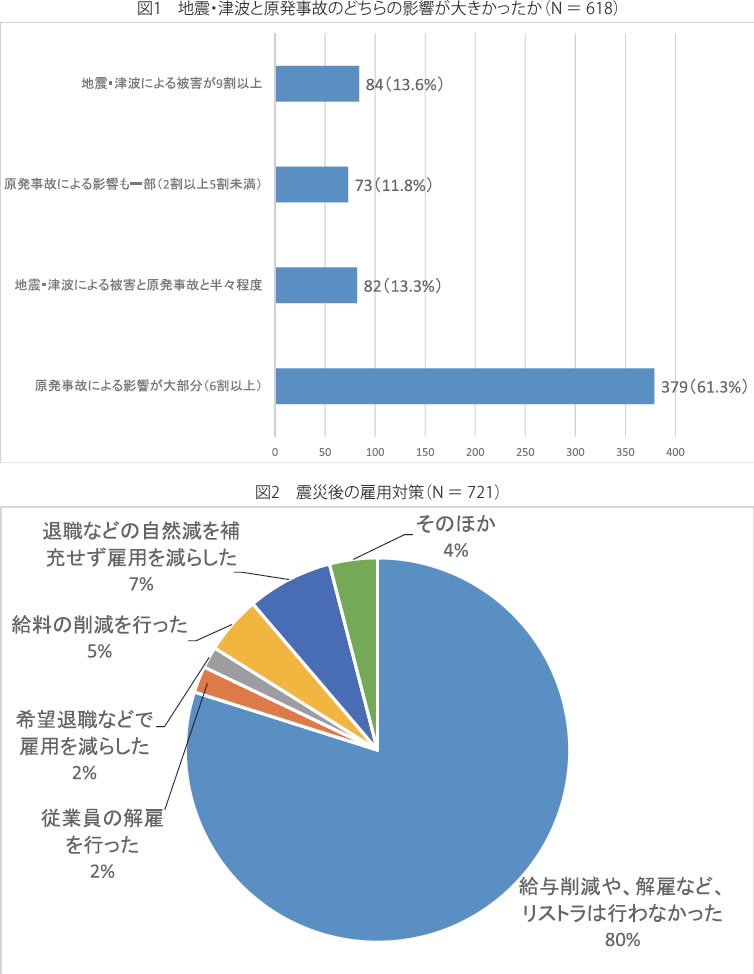 そして、別な質問で「震災後の雇用対策についてお答えください」という質問に対しては、「給与削減や解雇など、リストラは行わなかった」と回答する企業が8割を占めていました(図2)。これまでの災害とは異なって原発事故の影響もあったために、災害による直接被害だけでなく風評という間接被害によって売上高が大幅に減少した企業が多く存在していたわけですが、そんな中でも従業員重視の姿勢が貫かれていました。これがこのアンケートで判明した重要な2点です。