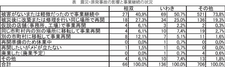 まず、アンケートでは、「大震災と原発事故による被害の程度がどうだったのか、したがって事業再開が順調になされているのかどうか」を質問しています。その結果、「被害が無いまたは軽微だった、あるいは改築修理ののち、同じ場所で事業を継続している」企業は、地震・津波・原発事故の被害を最も多く受けた相双・いわき以外を合算すると9割以上ですが、相双地方といわきはそれぞれ回答企業の7割前後とかなり低くなっています。逆の表現をすると相双・いわきでは「仮設の店舗・事業所や移転などを余儀なくされた、あるいは、再開のメドの立たない企業」が回答企業の3割いることを示しています。地震・津波・原発事故の直接的影響が相双・いわき地方にかなり集中的に発生していることがわかります(表1)。