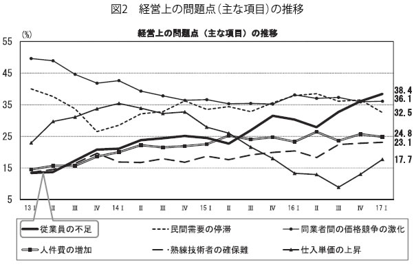 経営上の問題点では「従業員の不足」の指摘割合が最も高くなり、人材不足の深刻度が増しています(図2)。自社を取り巻く環境の変化に注意を払うとともに、採用と社員教育の計画を再度見直すなど、先を見据えた経営がますます求められています。
