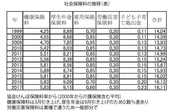 賃上げによる経営圧迫には、人件費増と同時に社会保険料の企業負担増があります。企業が負担している給料にかかる費用を(表)で合計してみました。1947年ノ3.6%の半分負担から2000年に介護保険導入も加わった健康保険料と厚生年金が徐々に引き上げられてきています。労働保険関係を加えると、2017年3月からで(65歳未満)=健康保険ガ5.83%<2017年の健康保険料率10.00%(都道府県でことなり、最低富山の9.80%から佐賀の10.47%の間で)+介護保険料率1.65%を折半>+厚生年金保険料9.15%(18.3%を折半)+雇用保険料は今年から3年間0.1引き下げで本人0.3%、企業0.6%+労働災害保険料率本人ゼロ、企業0.3%+子ども・子育て拠出金0.23%(※介護保険は40歳~65歳の雇用者が対象、労働災害保険料率は、業種で違い2015年0.25%~8.8%と大きく差があります)の合計で16.11%を占めています。これに給料を2%賃上げすれば、中小企業の平均賃金は厚生労働省の2014年賃金構造基本統計で年収が343万円ですから賃上げ6.8万円、社会保険等でさらに1人当り1万954円の企業負担が増えることになります。